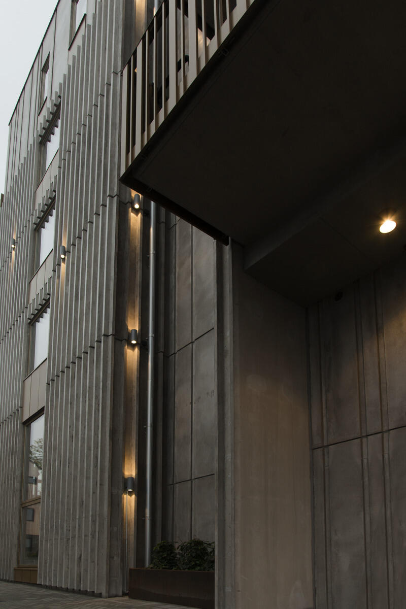 En nätt fasadarmatur i stilren konformad design. LED COB med reflektoroptik ger en asymmetrisk ljusbild som lyser upp både vägg och mark. Enkelt montage tack vare separat bakstycke med dubbla genomföringar och vidarekopplingsbar snabbplint. Distanser för utanpåliggande kabeldragning medföljer. IP65-klassad med tålig pulverlack för tuffa miljöer. Inbyggt drivdon med ställbar ljusnivå via DIP-Switch Power.